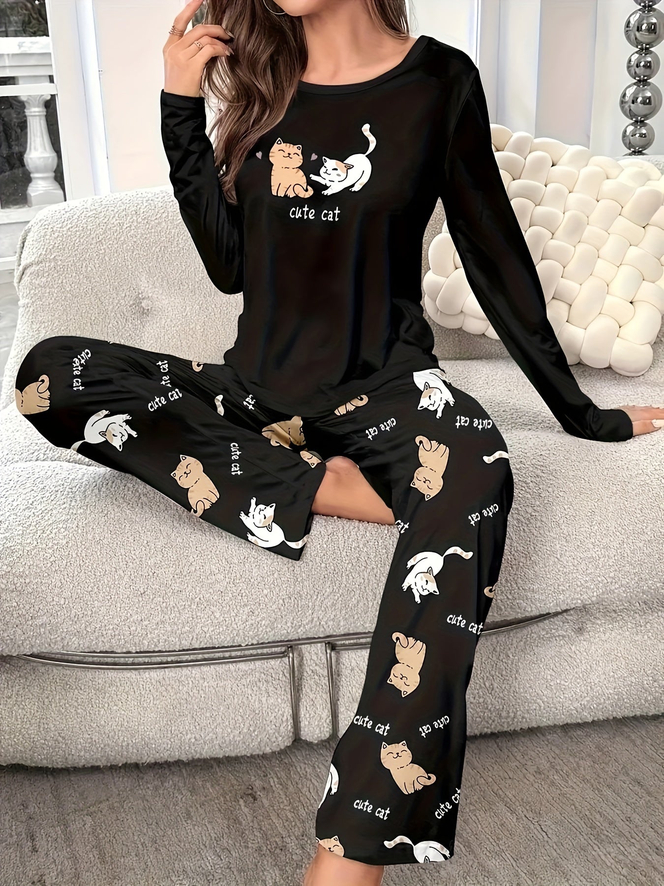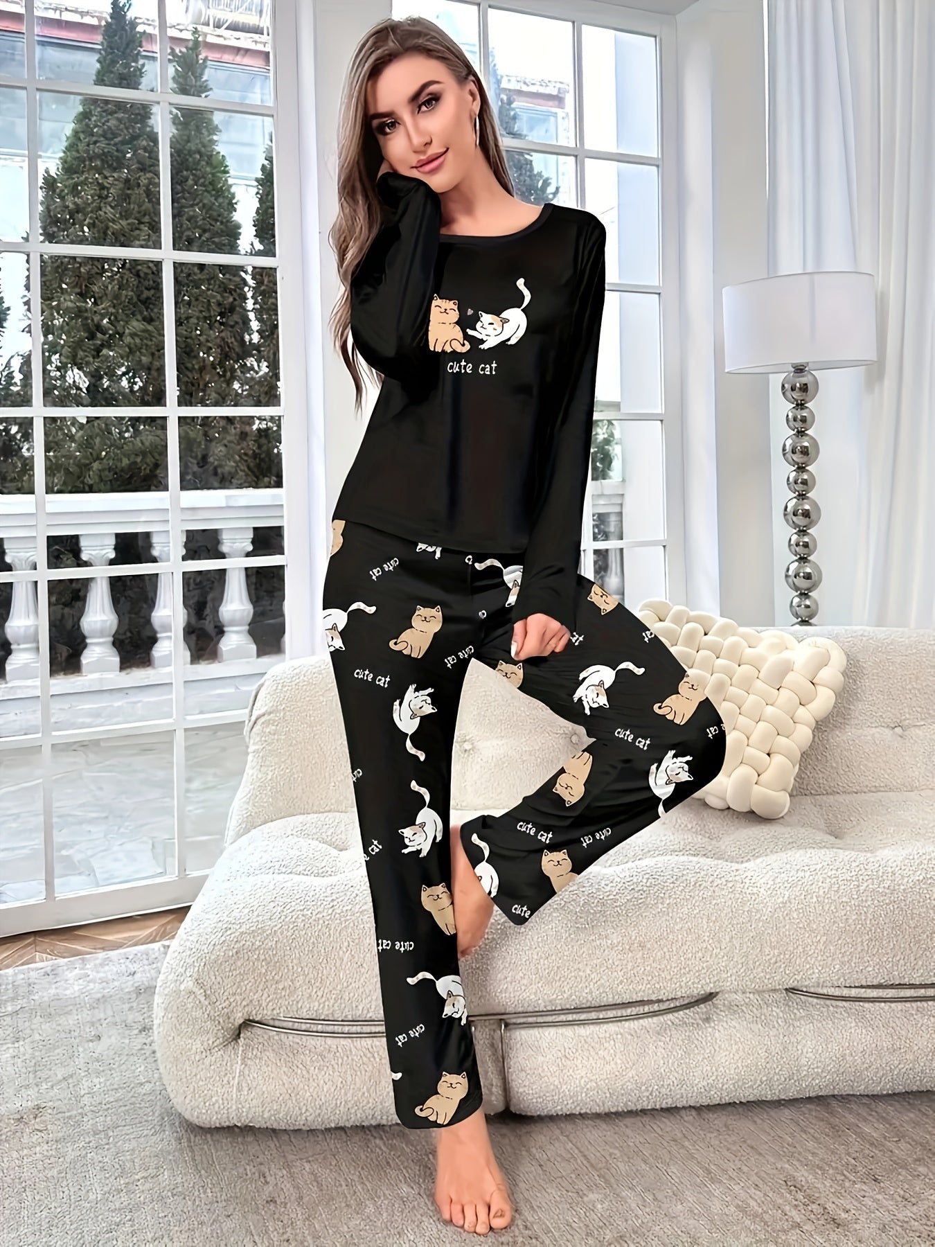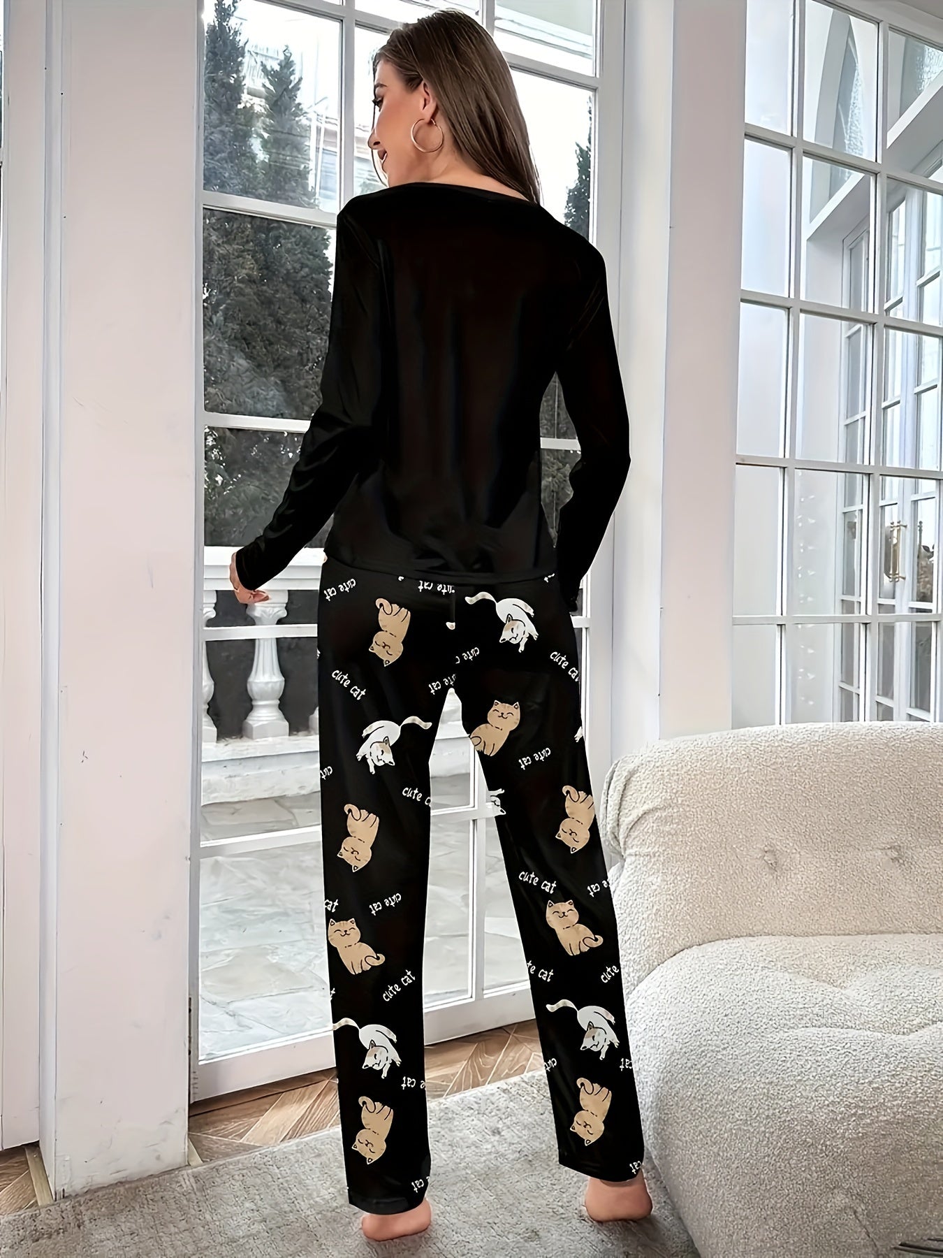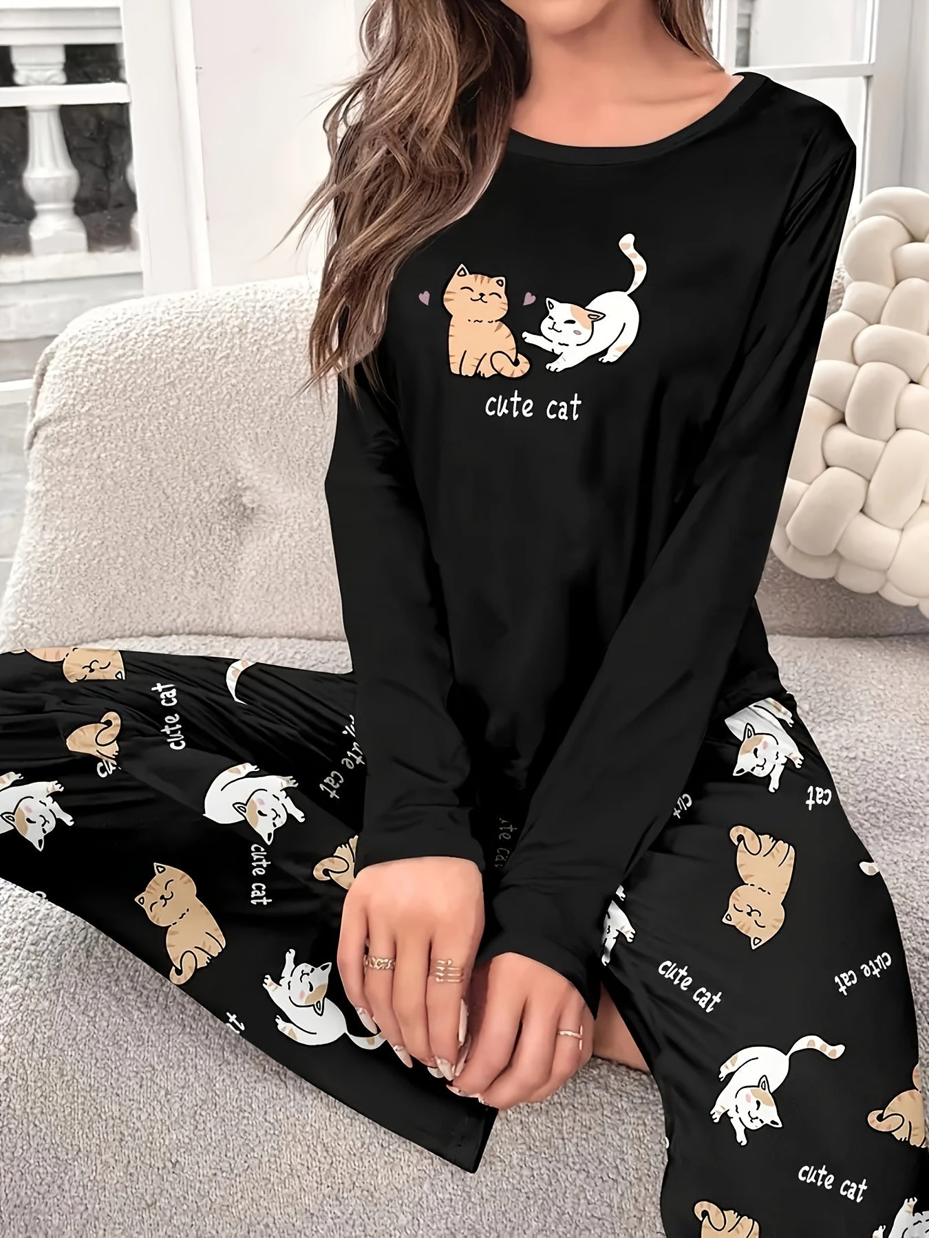 Dames pyjama set met kattenprint | Lange mouw en broek