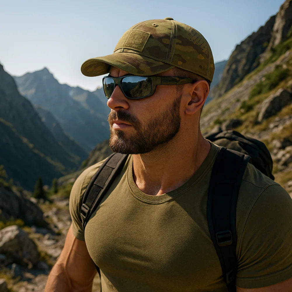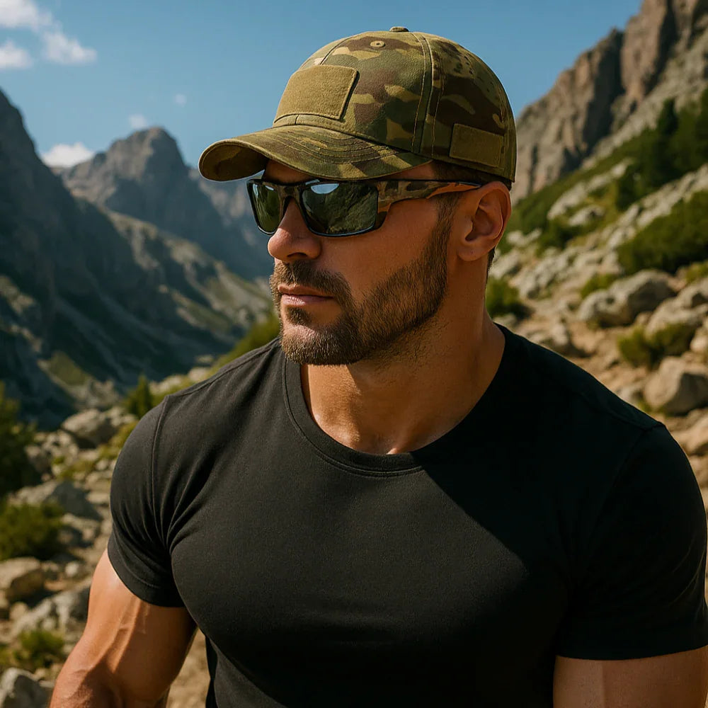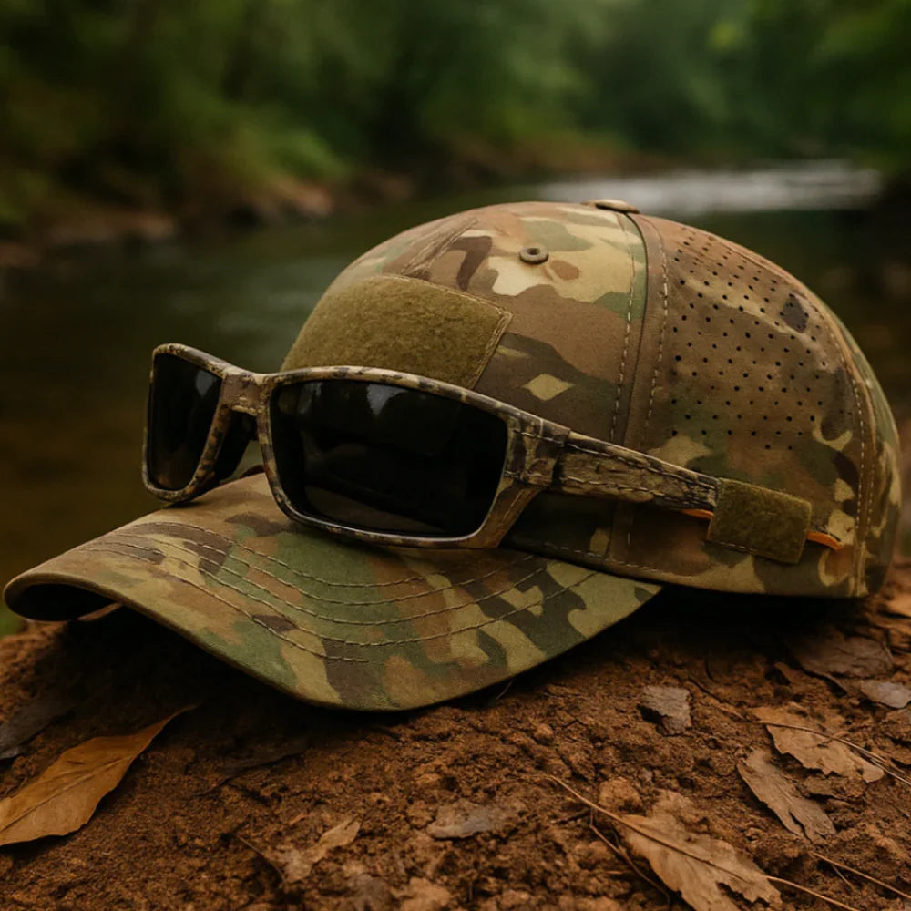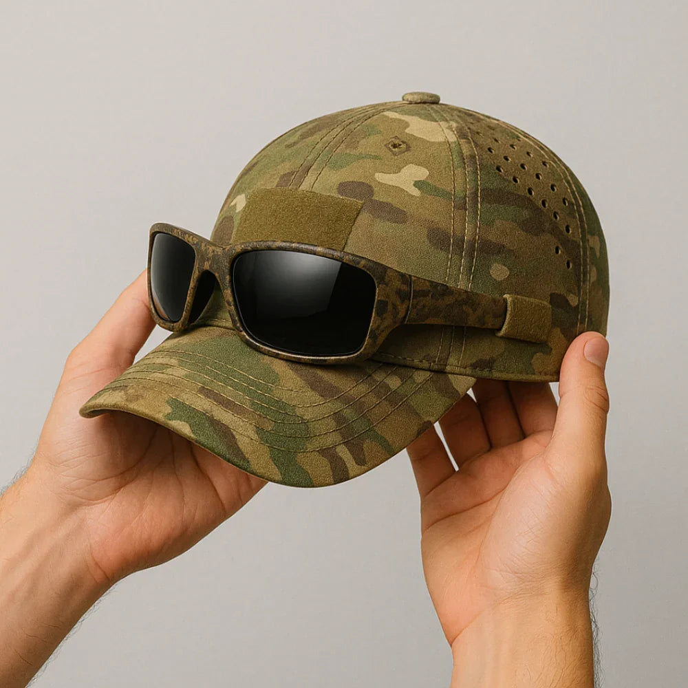 Deze stoere camouflage pet heeft een slimme geïntegreerde houder waarmee je jouw zonnebril stevig vastklikt – zónder dat je hem kwijtraakt, beschadigt of continue hoeft vast te houden.