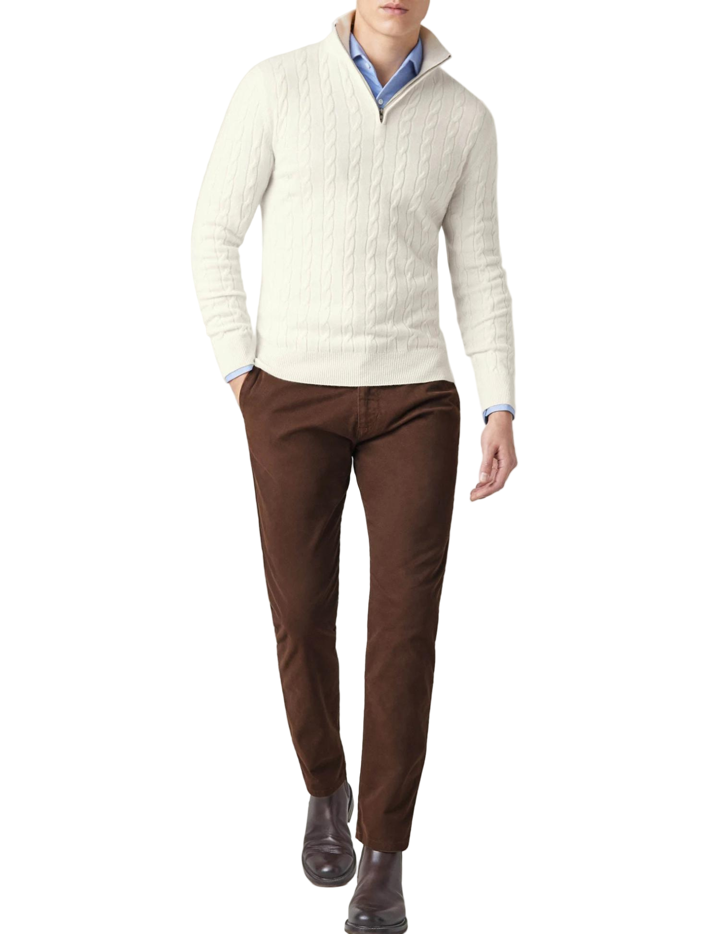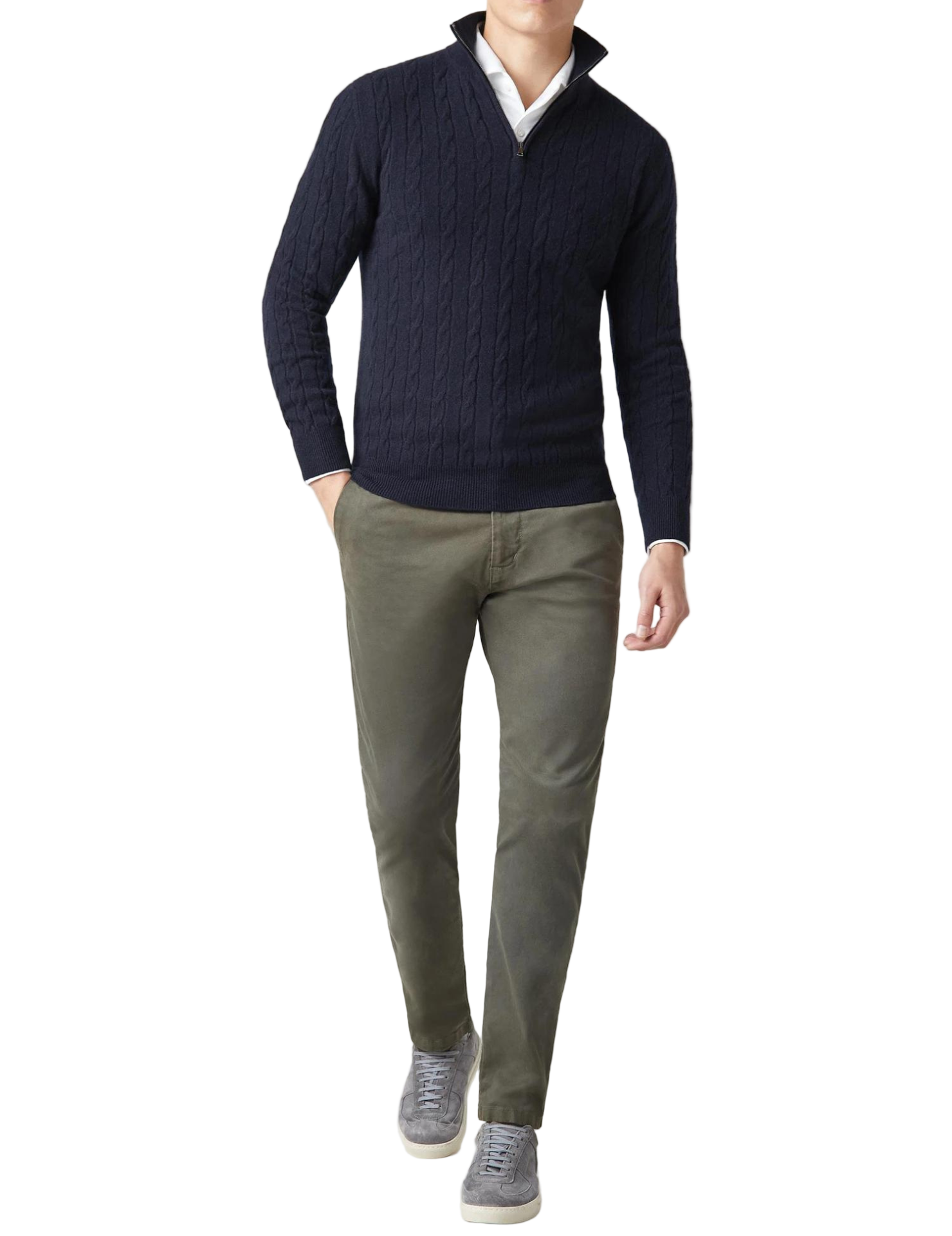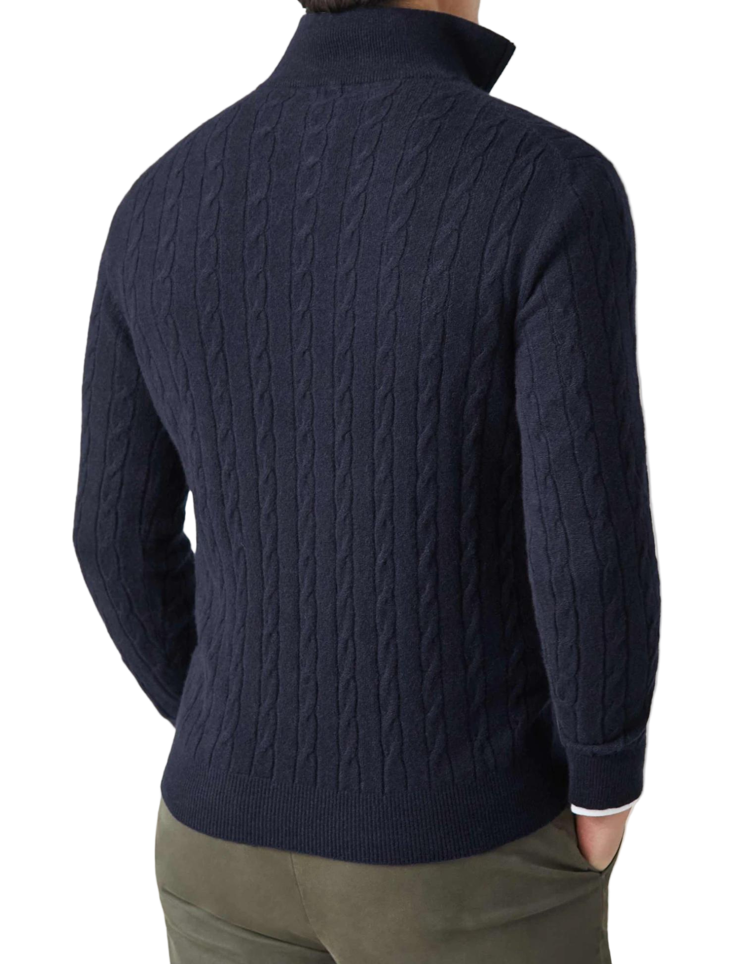 De Leighton trui tilt je wintergarderobe naar een hoger niveau. Met zijn klassieke kabelpatroon en moderne halve rits combineert hij verfijning met praktisch gemak. De funnel neck zorgt voor extra warmte en een elegante uitstraling, terwijl de hoogwaardige afwerking garant staat voor langdurig draagplezier. Perfect om te dragen naar je werk of in het weekend – deze trui biedt moeiteloze stijl en ultiem comfort in één.